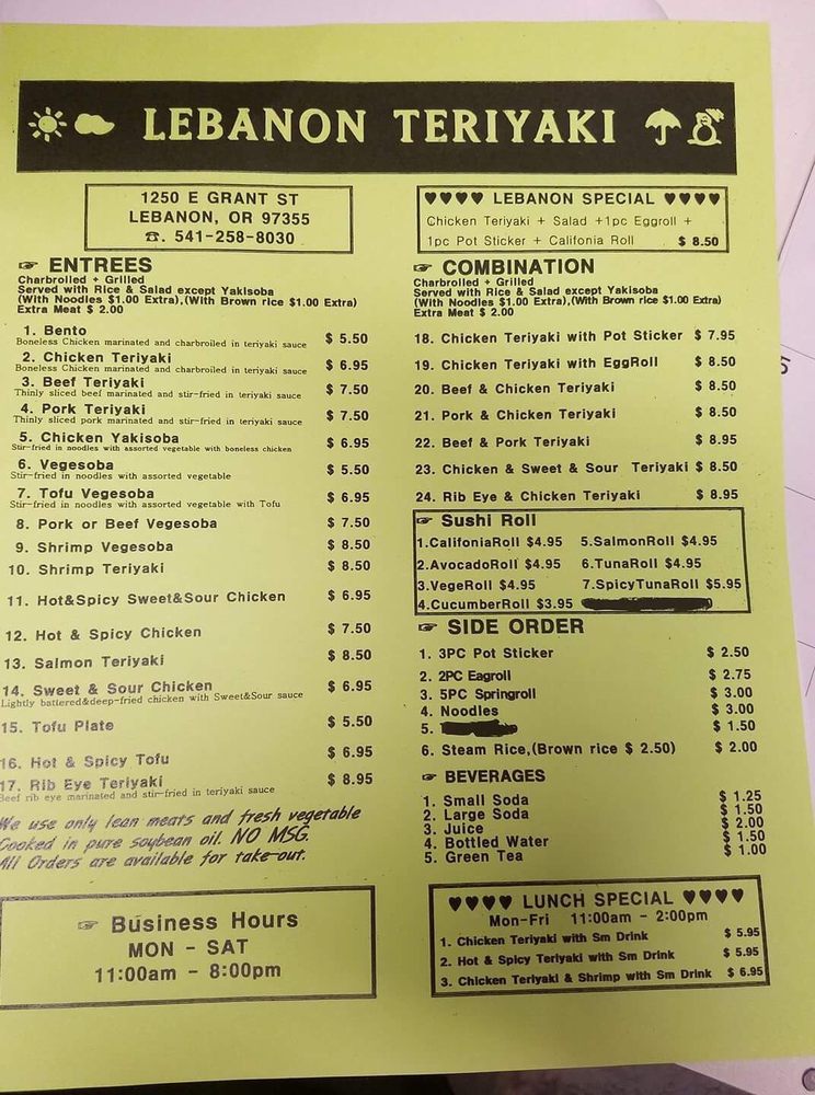 Located at 1250 E Grant St in Lebanon, OR, Lebanon Teriyaki offers an enticing selection of Japanese cuisine that delights the senses. Their menu features a variety of combo plates, including options like chicken, beef, pork, shrimp, and tofu, each served with rice and a vibrant salad drizzled with house-made dressing and teriyaki sauce. Prices are affordable, with most combos averaging around $15.50.